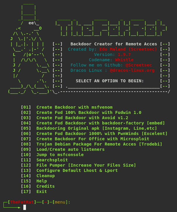 TheFatRat은 페이로드를 이용하여 악성 코드를 컴파일하는 도구이며, 컴파일된 멀웨어는 Linux, Windows, Mac, Android에서 실행될 수 있다.