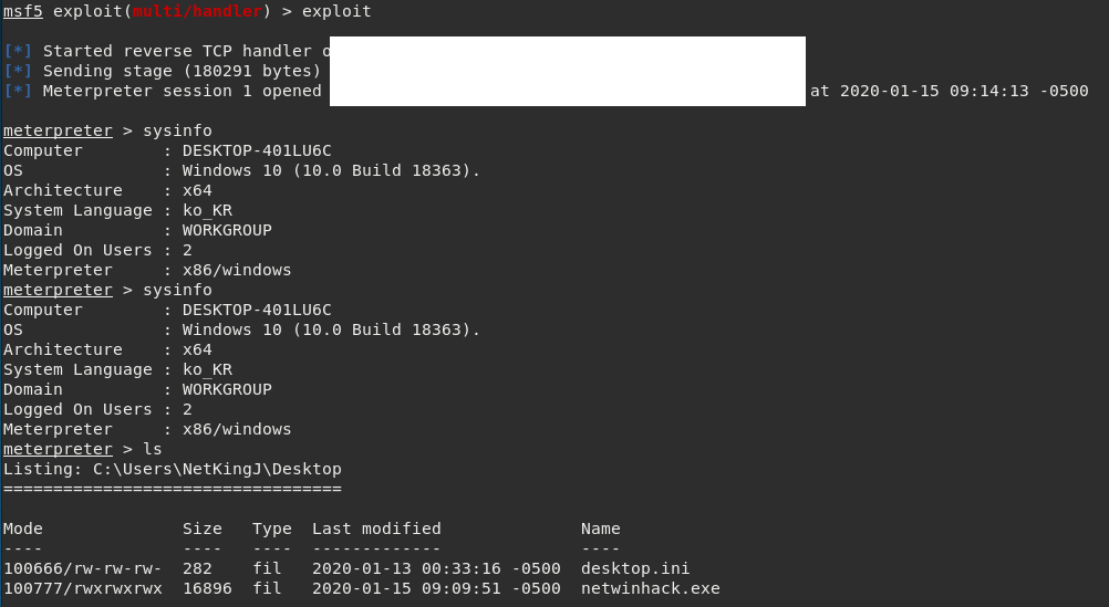 - msf5 exploit(multi/handler) > exploit