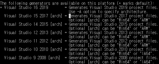 • $ cmake --help 통해 자신에게 맞는 Visual Studio 버전에 맞게 명령어를 찾으면 된다.