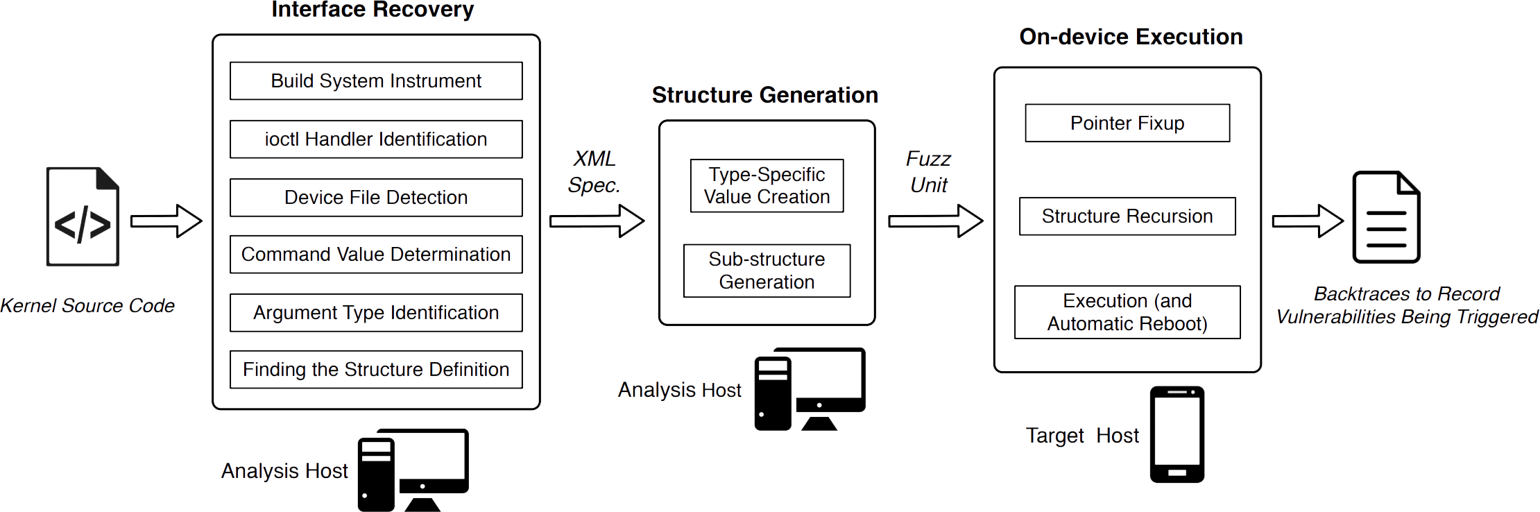 커널 자체는 코어 커널 코드와 장치 드라이버의 두 가지 코드 유형으로 나눌 수 있다. 전자는 시스템 호출(syscall) 인터페이스를 통해 액세스 하여 사용자가 파일(open() 시스템 호출)을 열거나 프로그램 실행(execve() 시스템 호출)하는 등의 작업을 수행할 수 있다. 후자는 POSIX 호환 시스템(휴대폰 시장의 98% 이상을 차지하는 예: Linux/Android/FreeBSD/IOS)은 일반적으로 ioctl 인터페이스를 통해 액세스 된다. 특정 시스템 호출로 구현된 인터페이스는 입력 전송을 장치 드라이버에 의해 처리되도록 한다. 구글에 따르면 안드로이드 커널(Linux와 유사한 것)에 대해 보고된 버그 중 85%가 타사 기기 공급업체가 작성한 드라이버 코드에 있다. 모바일 장치의 수가 지속적으로 증가하고 보안이 중요해짐에 따라 공격자가 악용하기 전에 장치 드라이버의 취약점을 식별하는 자동화된 접근 방식이 매우 중요하다.