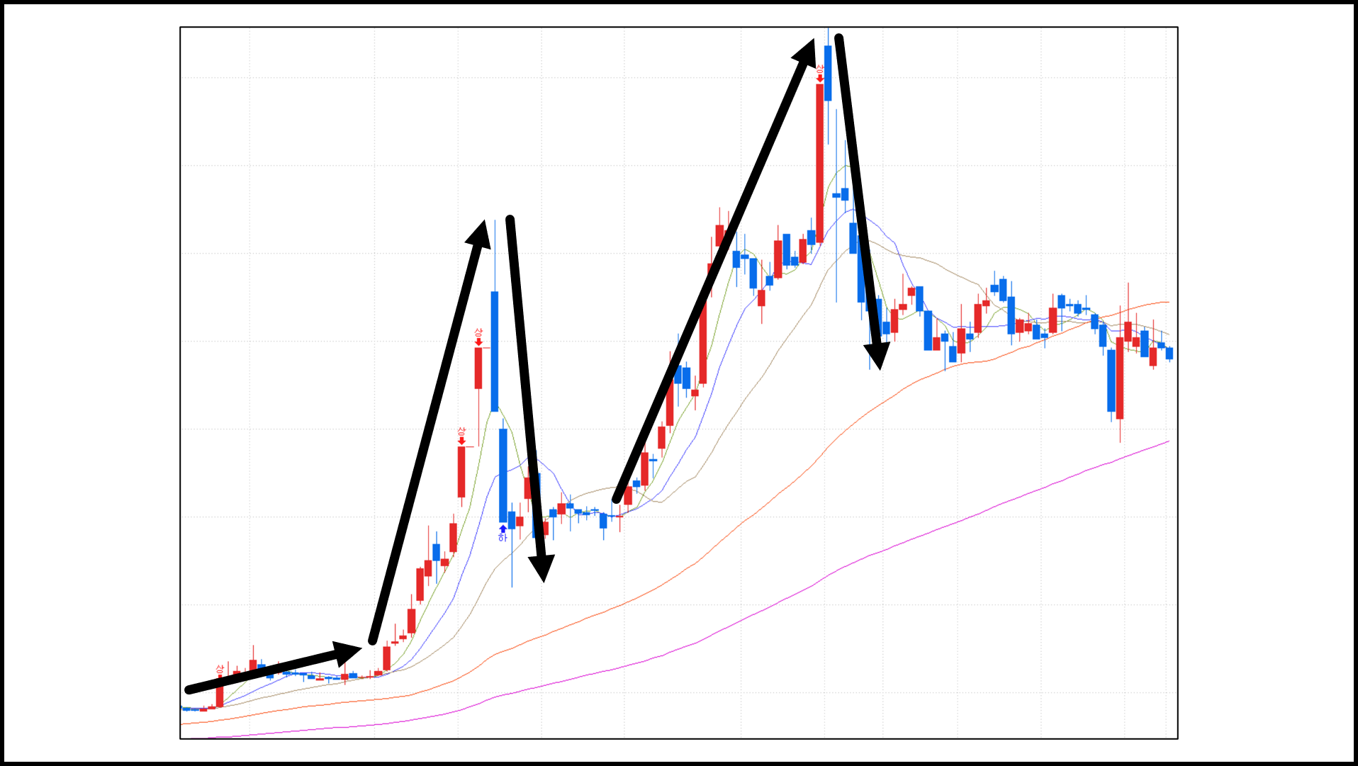 - 설명 : 1번 구간에서 내려간 길이만큼 2번 구간 뒤에 3번 구간과 같이 상승함으로 2~3번 구간 사이를 매수 구간이라고 해.