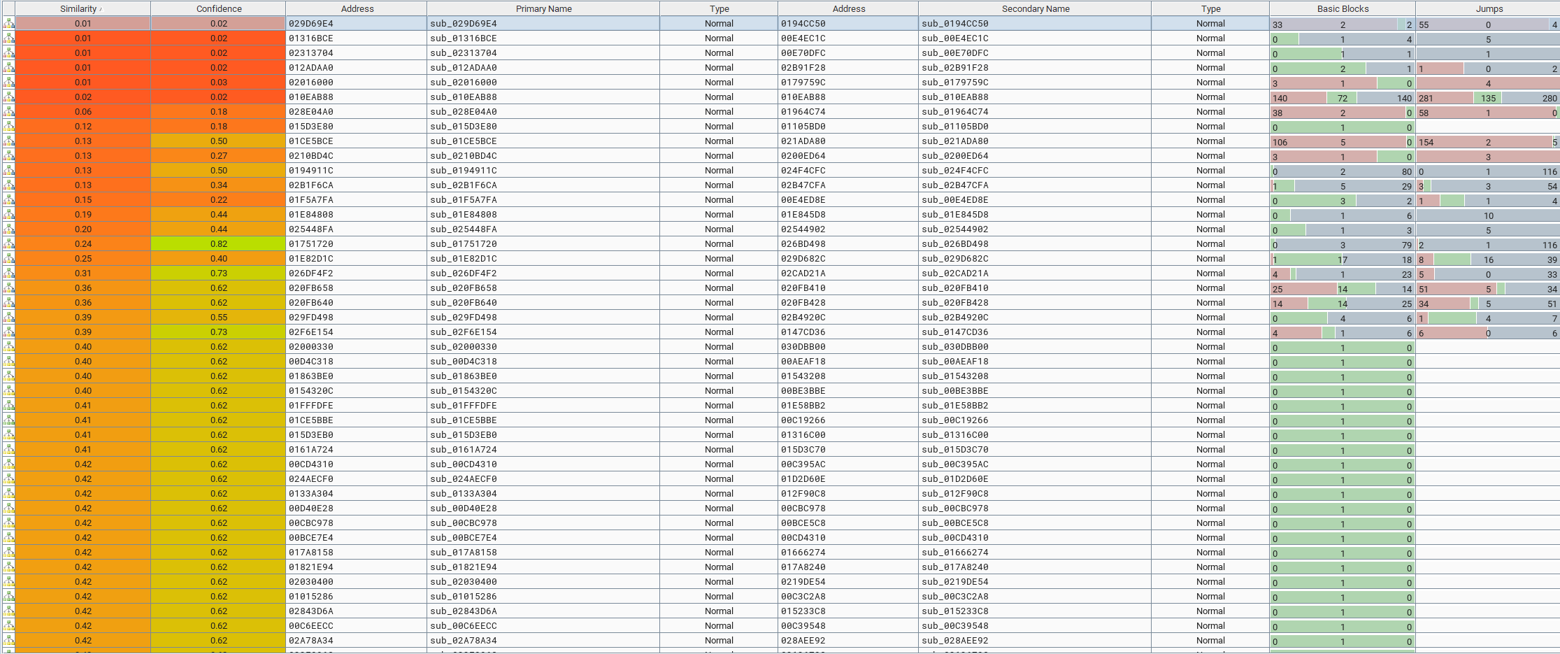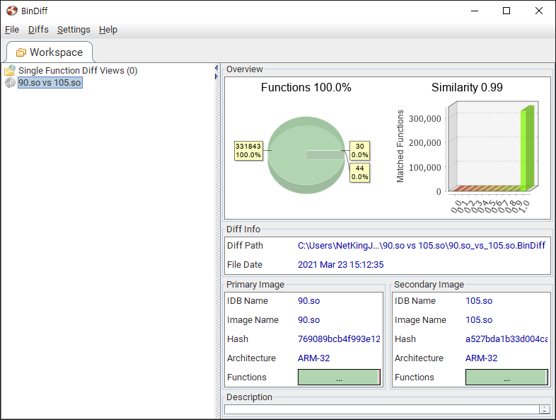2개의 라이브러리(libwebviewchromium.so)를 가지고 먼저, IDA에서 바이너리 읽어와서 BinDiff로 비교해보았다.