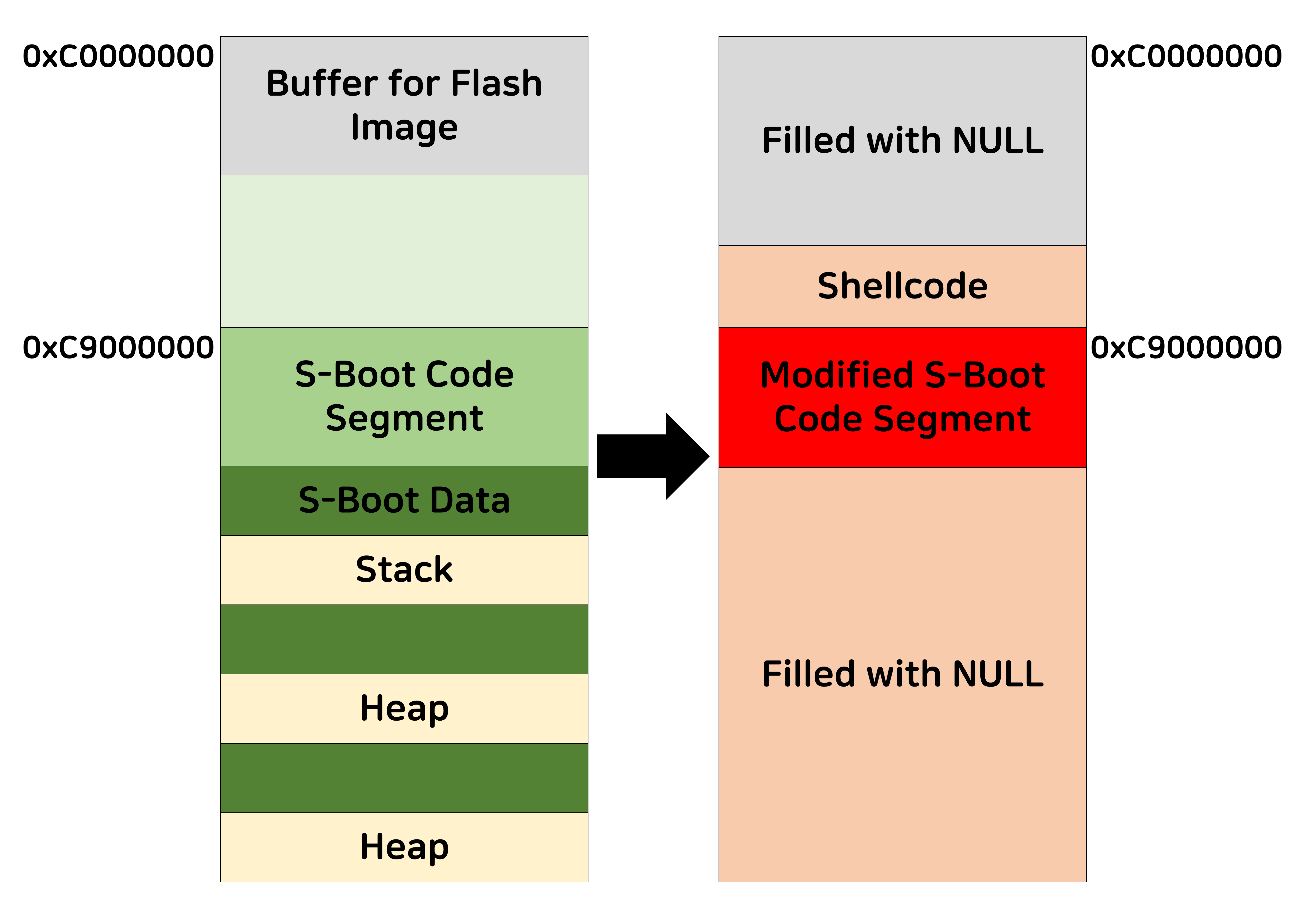 해당 취약점은 Normal World인 EL0의 User Mode에서 EL1(Kinibi)의 SVE/Sys/Abort Mode에 접근하는 것으로 먼저, Odin을 통해 Odin Mode initial 및 settings와 Flash PIT, Flag image의 opCode 값을 가져옵니다. 다음 Fig. 6.와 같이 Integer overflow 발생하는 원인으로 0x1e00000 보다 낮으면 0xC0000000을 사용하고 그렇지 않다면, 0xB0000000을 사용합니다. 참고로 Galaxy S8 이전 단말기는 0xC0000000이며, Galaxy S9 이후 단말기는 0x880000000의 버퍼를 복사합니다.