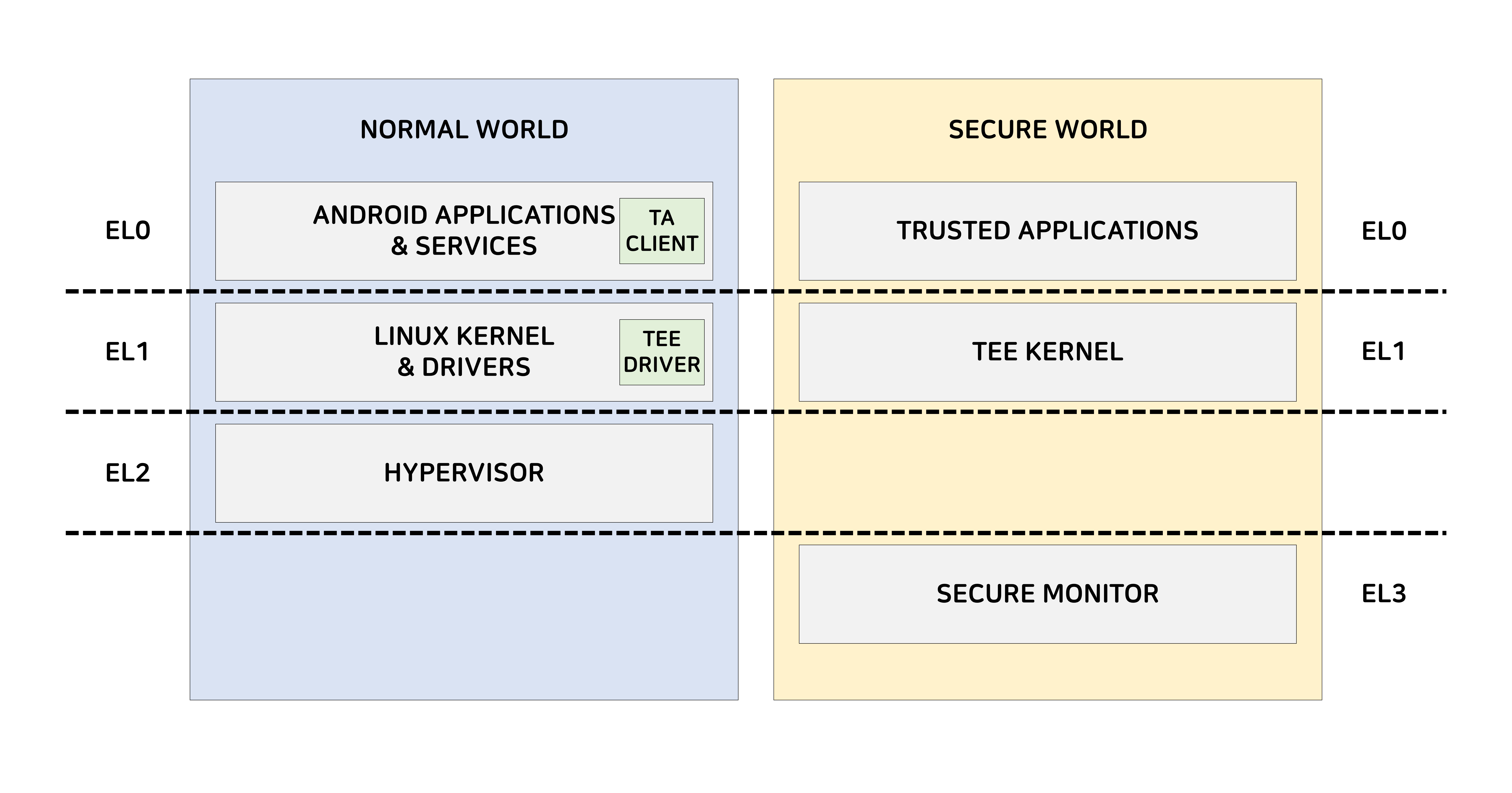 Fig. 2.의 TrustZone 아키텍처에서 TEE는 보안 EL1 수준에서 실행됩니다. Trusty 애플리케이션을 그 위에 로드하고 보안 EL0 수준에서 실행할 수 있고, TrustZone을 사용하면 NS(Non-Secure Flag)로 메모리에 태그를 지정하여 Secure World 메모리를 Normal World에서 격리할 수 있습니다. Normal World에서 실행되는 코드는 NS로 태그가 지정된 메모리에만 액세스할 수 있습니다.
