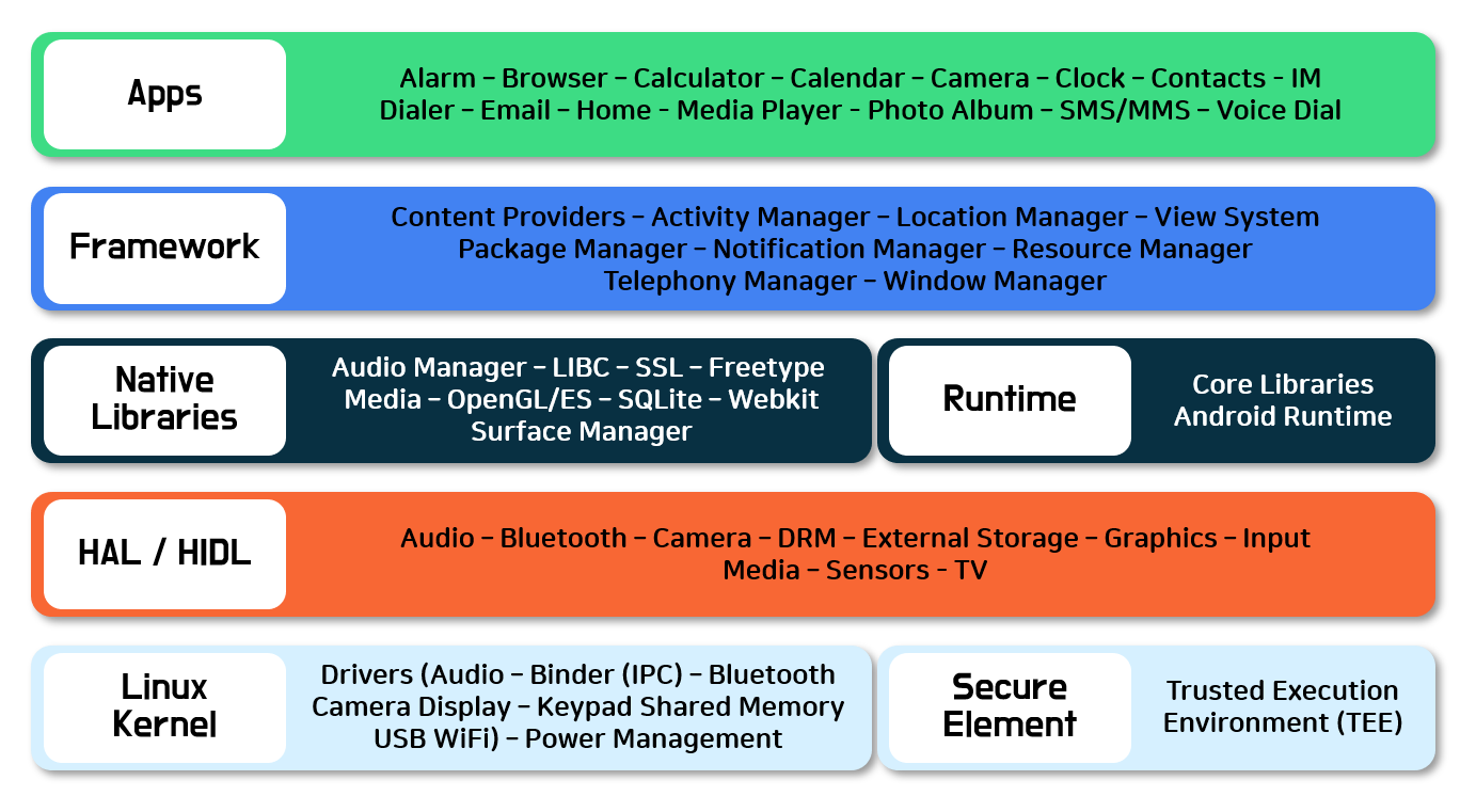 ㆍ애플리케이션 프레임워크 : 애플리케이션 개발자가 가장 자주 사용하며, 하드웨어 개발자는 개발자 API를 알고 있어야 합니다. 이는 다수의 API가 기본적인 HAL 인터페이스에 직접 매핑되고 구현 드라이버에 관한 유용한 정보를 제공할 수 있기 때문입니다.