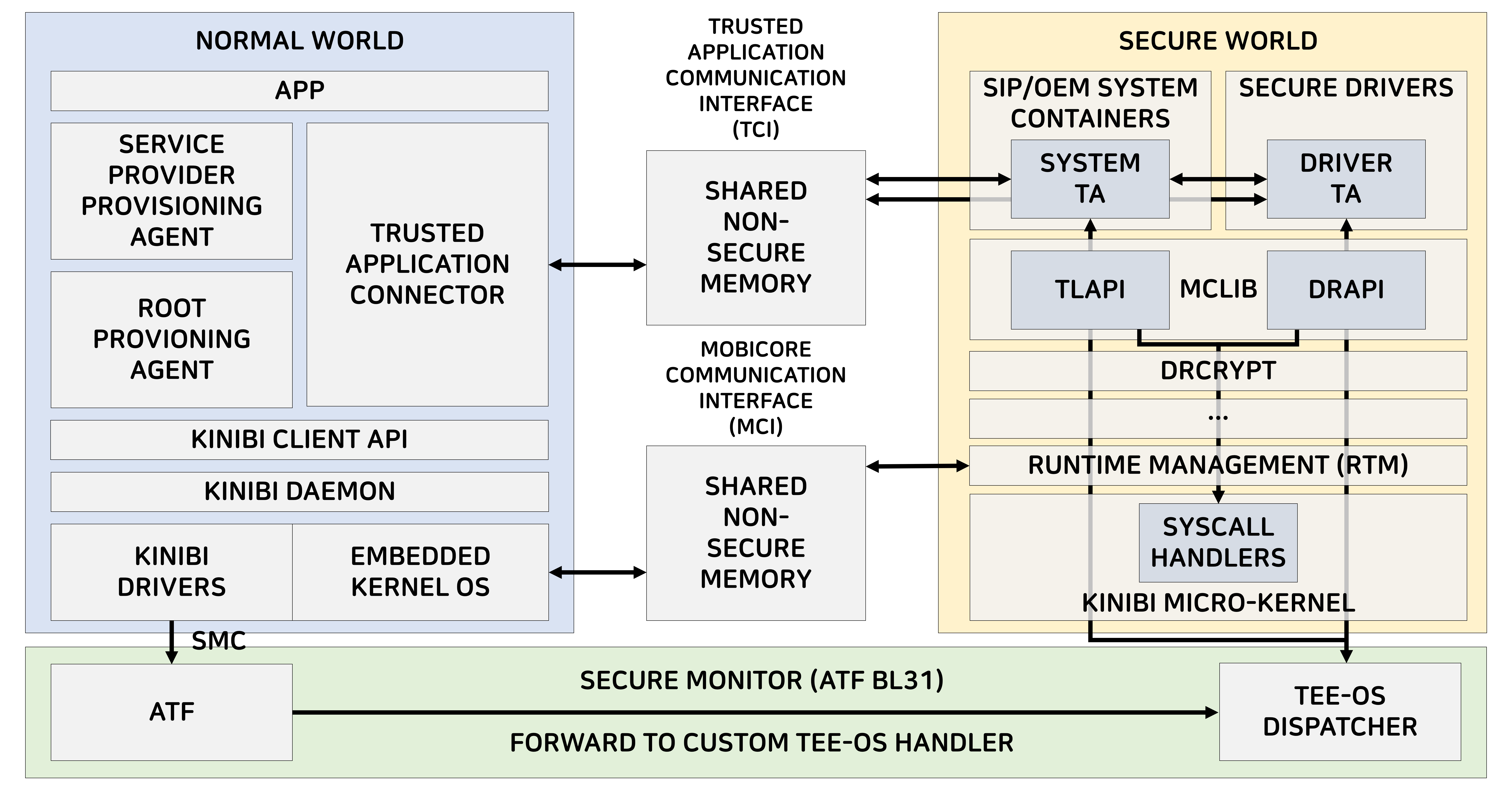 ㆍNormal World에서 Drivers, Daemons, Libraries 그리고 Interfaces는 Secure World와의 통신은 SMC 및 공유 메모리 버퍼를 통과합니다.
