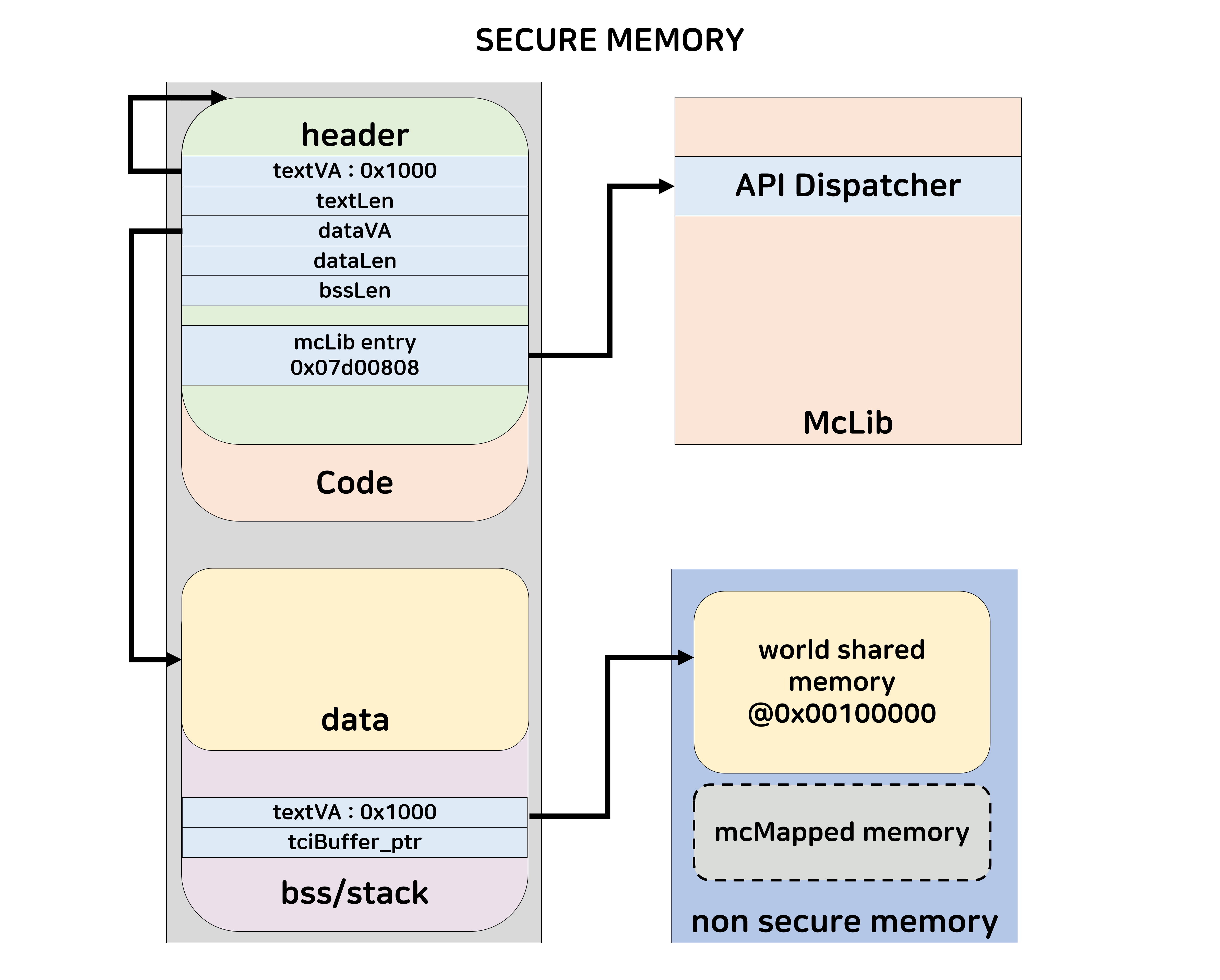 TA가 로드되면 Kinibi에서 MCLF 헤더를 사용하여 TA 메모리 공간의 코드, 데이터 및 bss 영역을 매핑합니다. mcLib 라이브러리는 고정 주소(0x07d00000 - Galaxy S8, S9)에 매핑됩니다. 또한, 세션이 열리면 공유 버퍼(tci)도 MCLF 헤더에 지정된 버전에 따라 고정 주소(0x00100000, 0x00300000)에서 매핑됩니다.