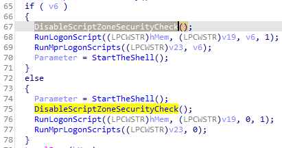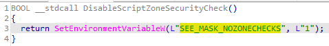 해당 함수가 호출된다면, 모든 사용자 레지스트리의 SEE_MASK_NOZONECHECKS = 1로 환경 변수를 설정하는 코드로 파일을 실행했을 때 경고창이 뜨지 않게 한다.