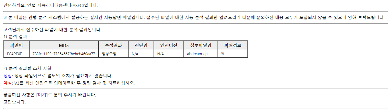 PC에 USB 연결 후 A 파일에 의해서 B 파일이 실행되는데 이때 Windows 7 환경에서만 Windows 탐색기(explorer.exe) 실행한다. 또한, 아래와 같이 안랩에 분석 의뢰와 함께 종합적으로 분석한 결과는 악성코드가 아닌 것으로 판단된다.