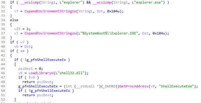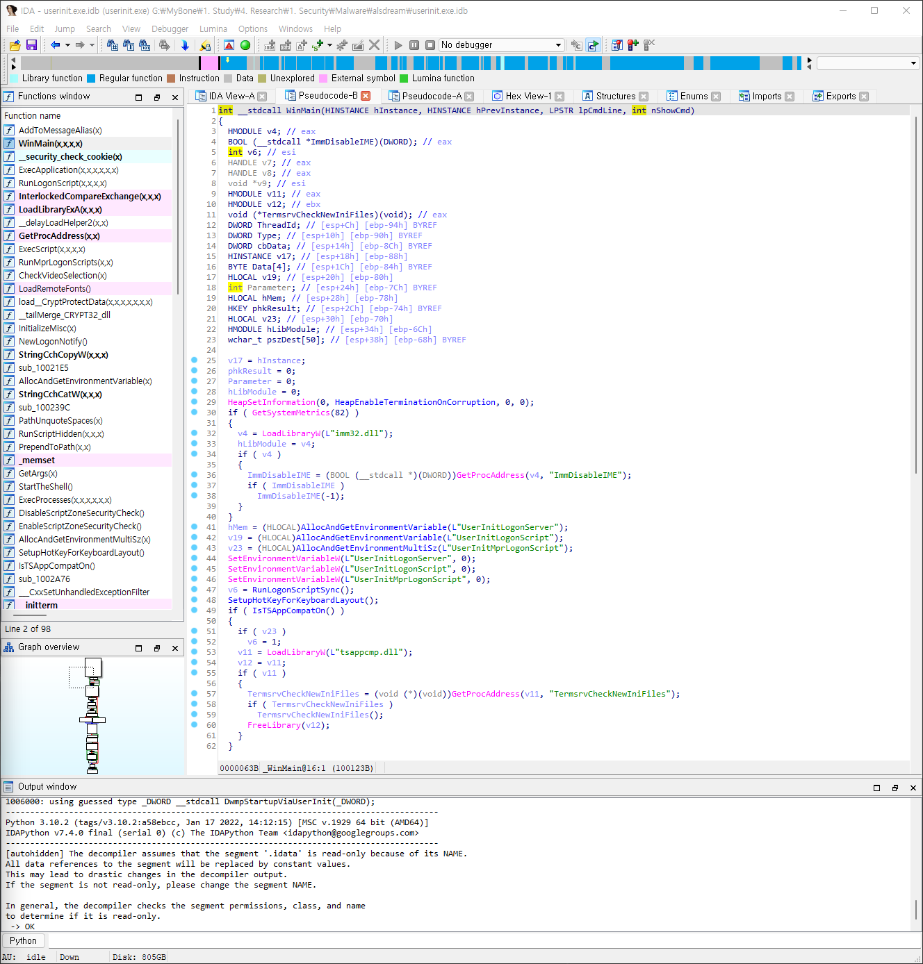 WinMain 함수에서 디컴파일된 코드를 살펴보면, 아래와 같이 Windows 사용자 로그온 관리자인 "userinit.exe" 프로그램과 비슷한 역할을 수행하고 있음을 짐작할 수 있다. 그러나 같은 용량인척 숨겨진 코드가 어디있을지 꼼꼼히 살펴보자. (문디자슥 으딨어?! 🤨)