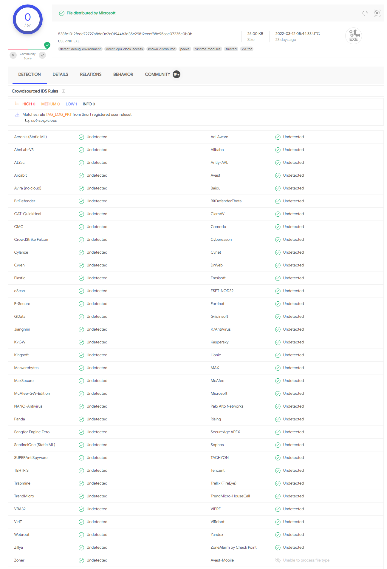 C 파일은 당연히 아무런 감지된 부분이 없지만, B 파일은 "W32.Virut"라고 윈도우 시스템 프로세스인 Winlogon.exe에 공격자가 임의 코드를 Injection 하는 행위를 통해 서버와 접촉하는 바이러스로 의심된다.