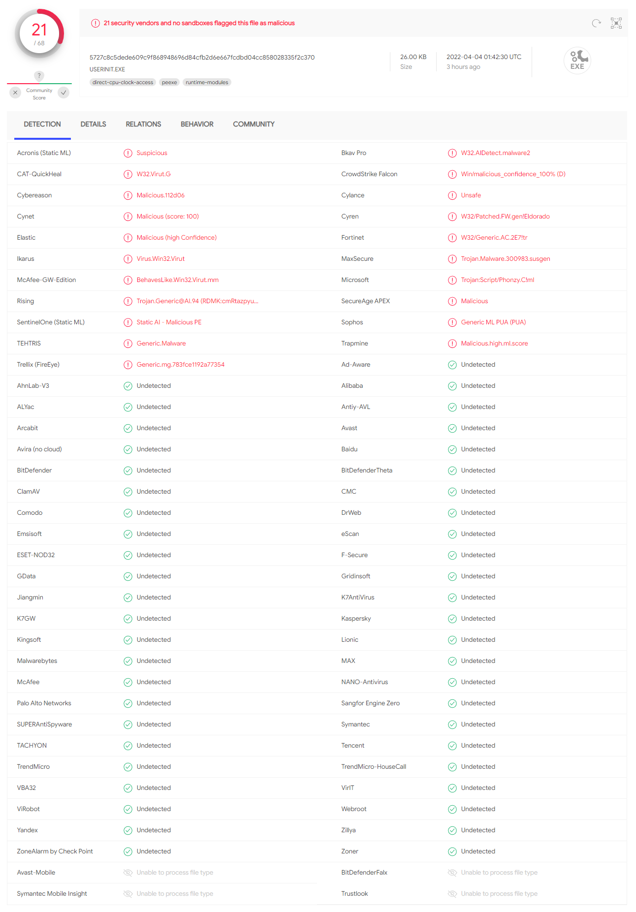 분석을 시작하기 앞서, 간단하게 의심되는 B 파일와 정상 C 파일간 Virustotal을 통해 살펴보았다.